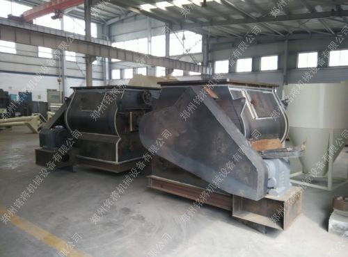 用在全自動干粉砂漿生產線上的雙軸無重力混合機已經組裝完畢,只等噴漆了。